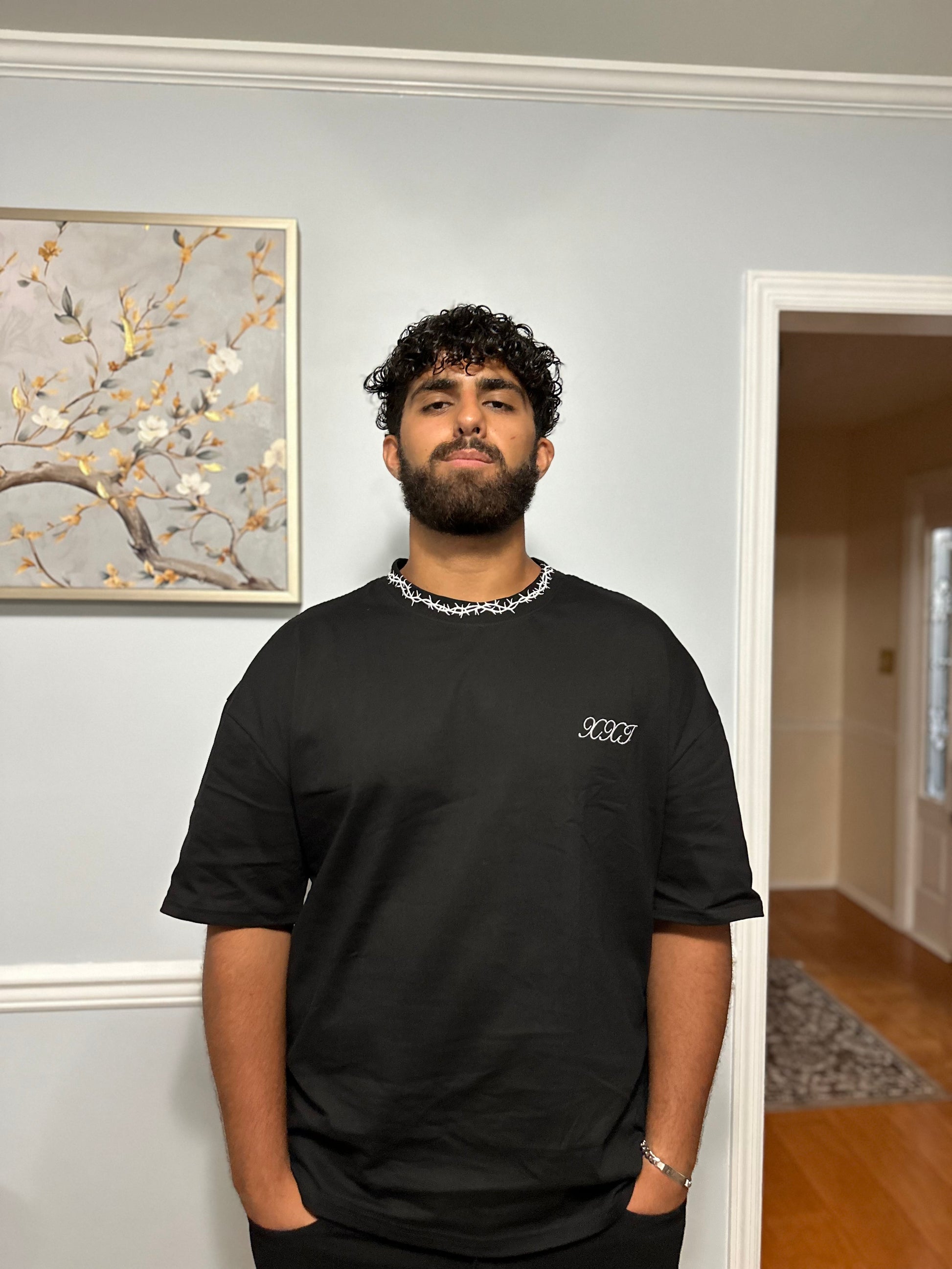 Black t-shirt with thorns around the neckline. XXI on the front of the shirt. Everything is embroidered. The shirts run big, order a size lower than your regular size.
